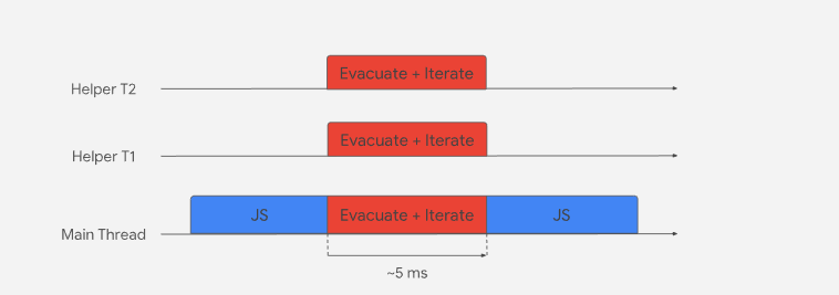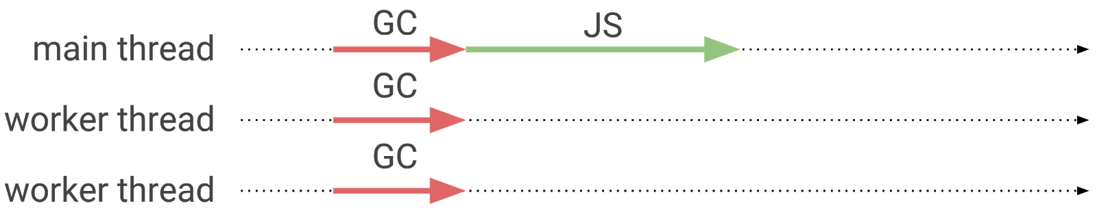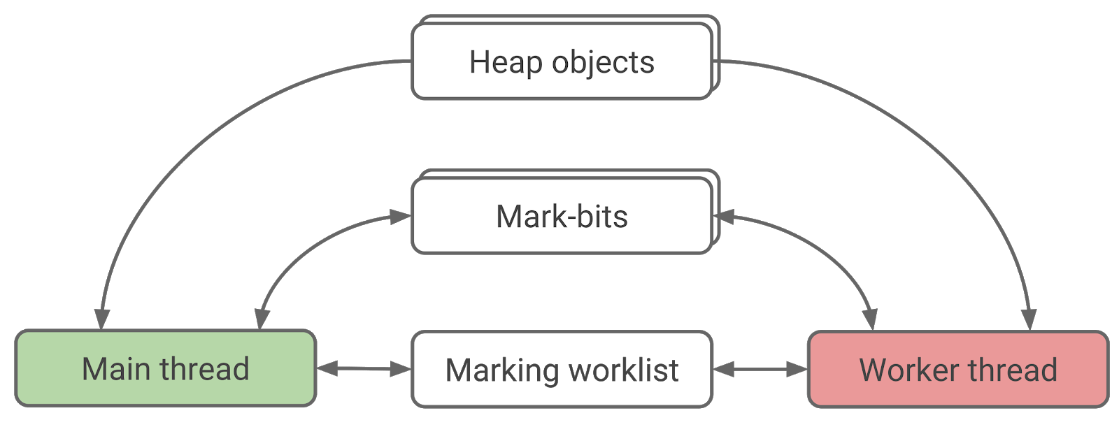 이 질문을 해결하는 것이 Concurrent Marking이다. 자세한 구현 내용은 매우 어렵지만, Worker 스레드들이 Heap의 객체 그래프를 방문하는 동안 JS가 메인 스레드에서 실행될 수 있도록 해 주는 방법이다.