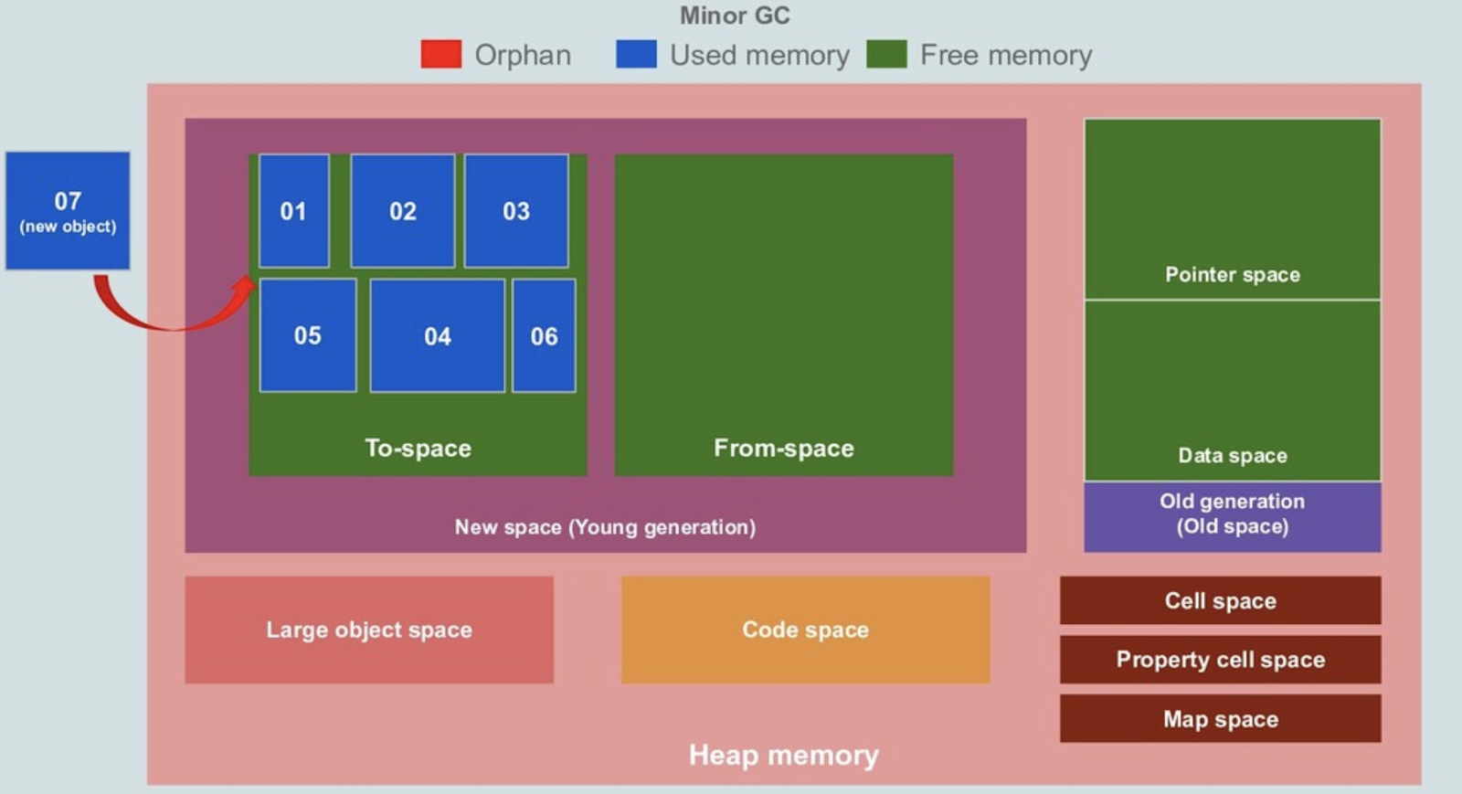 이 공간은 From / To Space로 2개의 영역(역할)으로 나눠지며, 객체들은 항상 To Space에 할당되는데, 객체에 대한 메모리를 할당할 때마다 증가하는 할당 포인터가 존재하고 이 값이 해당 Space의 끝에 도달하게 되면 Minor GC(Scavenge)가 발생하게 된다.